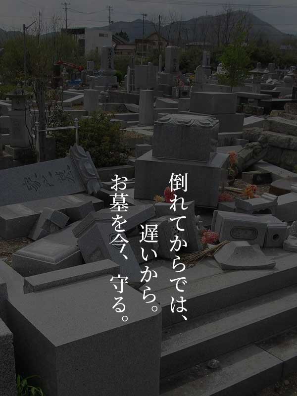 しかし古いお墓は石を積み上げただけの状態であったり、セメントで施工してあったりするものもあり、震度4~5程度の地震で倒壊する可能性が大きいと言われています。